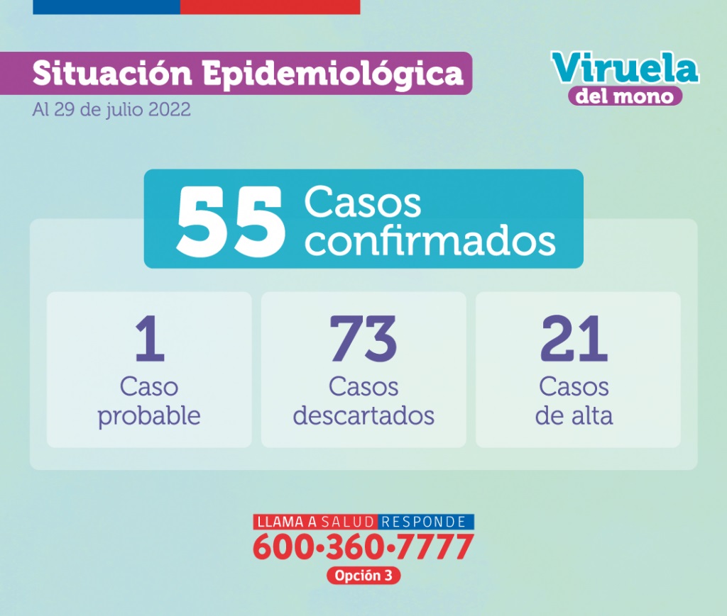 El Ministerio de Salud (Minsal) confirmó 55 casos de viruela del mono en Chile, en su último reporte publicado este viernes 29 de julio. La autoridad sanitaria también indicó que además existe un "caso probable", "73 casos descartados" y "21 casos dados de alta".
