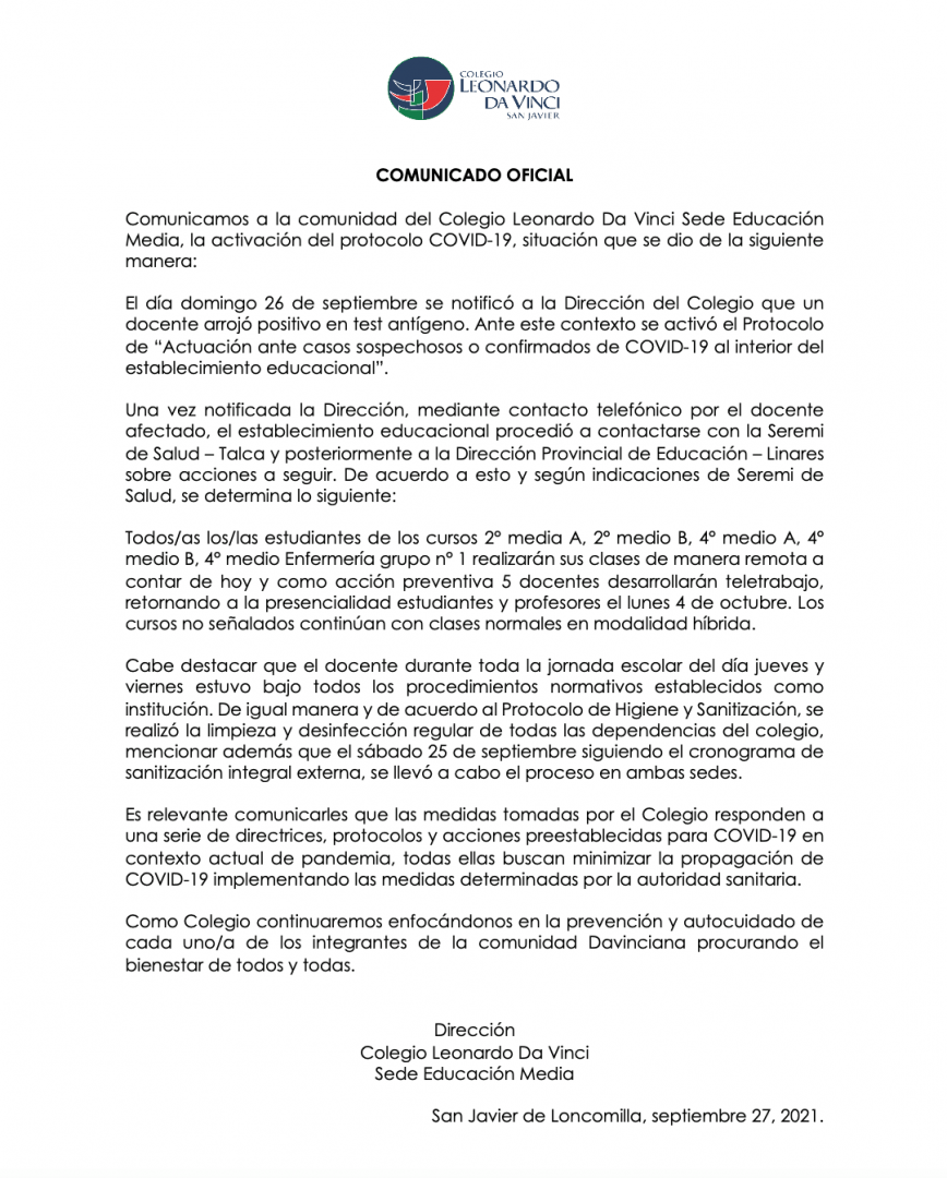 El Colegio Leonardo Da Vinci Sede Educación Media en San Javier, región del Maile, informó a través de un comunicado que uno de sus profesores dio positivo al Covid-19. El hecho fue notificado este domingo 26 de septiembre, momento en que se activó el protocolo correspondiente.