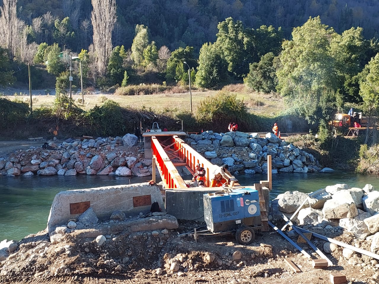 45 kilómetros al oriente de la ciudad de Parral, en las cercanías del embalse Bullileo, personal de la administración directa de la Dirección de Vialidad del Ministerio de Obras Públicas (MOP) trabaja en la reconstrucción del puente Vejar, el cual colapsó con los temporales de 2023.