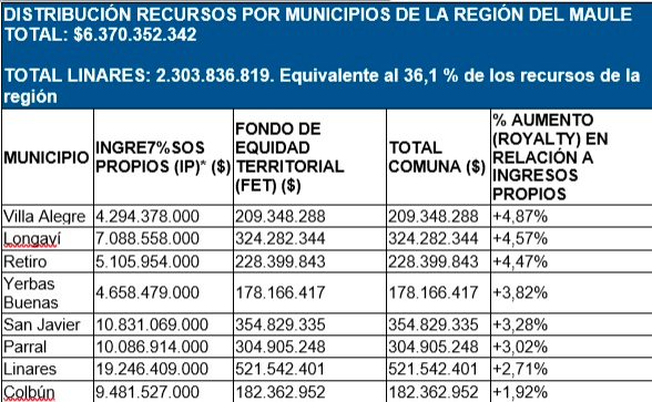 La comuna que recibirá mayor ingreso es Linares y los municipios cuyo presupuesto aumenta más en comparación a los ingresos propios son Villa Alegre (+4,87%), Longaví (4,57%), Retiro (4,47%).