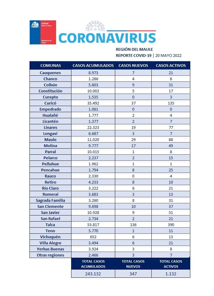 Región del Maule registró 347 nuevos casos de Covid-19