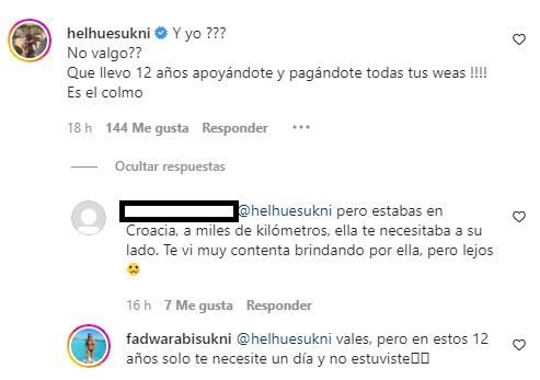 Tras esto, Sukni no se contentó con el mensaje y no tardó en reclamarle a su hija. “¿Y yo? ¿No valgo? Que llevo 12 años apoyándote y pagándote todas tus h… Es el colmo”, sentenció Huelhue.
